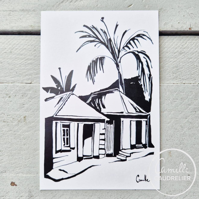 Cette carte postale est une reproduction en petit format d'une oeuvre originale peinte en 2024 par l'artiste peintre Camille Caudrelier. Inspirée par le patrimoine architectural de la Guadeloupe, elle propose ici une interprétation de la case créole et son jardin.
